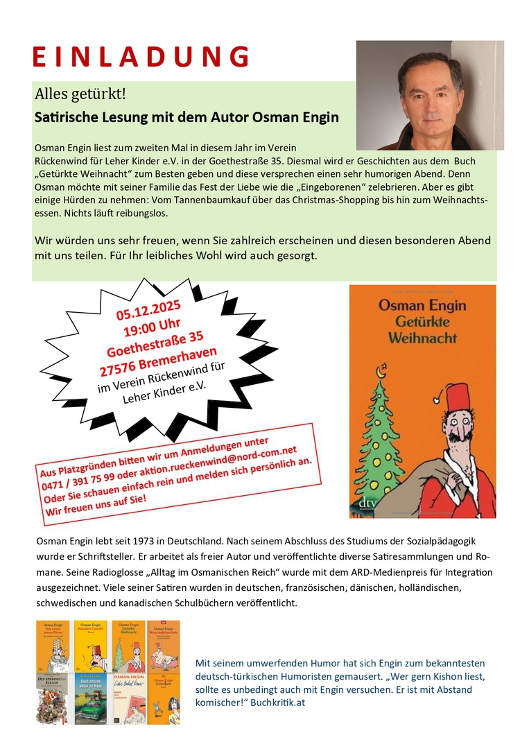 Na, Ihr Lieben. Lust auf eine humorvolle Lesung mit Osman Engin? Direkt im Rückenwind? Ihr seid herzlich dazu eingeladen. Und zwar am Freitag, 16. Mai 2025, um 19 Uhr geht es los.